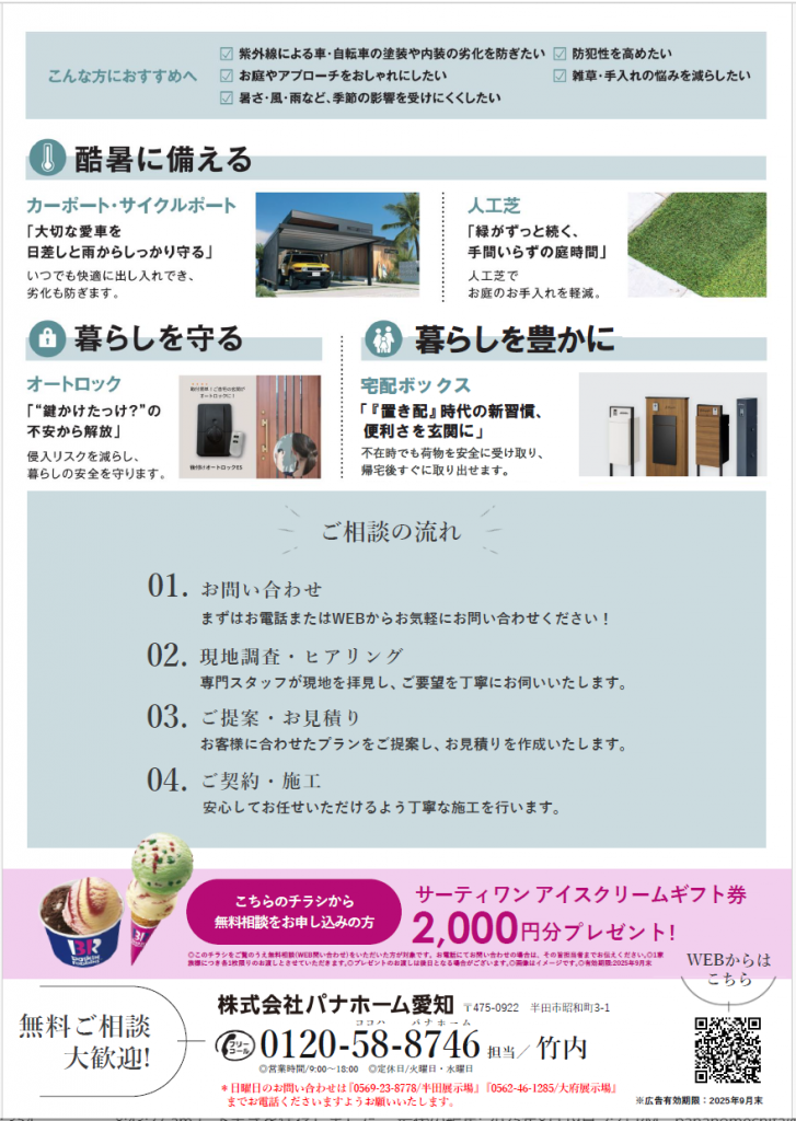 ◎こちらのフォームより無料相談(WEB問い合わせ)をいただいた方が対象です。◎1家族様につき各1枚限りのお渡しとさせていただきます。◎プレゼントのお渡しは後日となる場合がございます。◎画像はイメージです。◎有効期限:2025年9月末