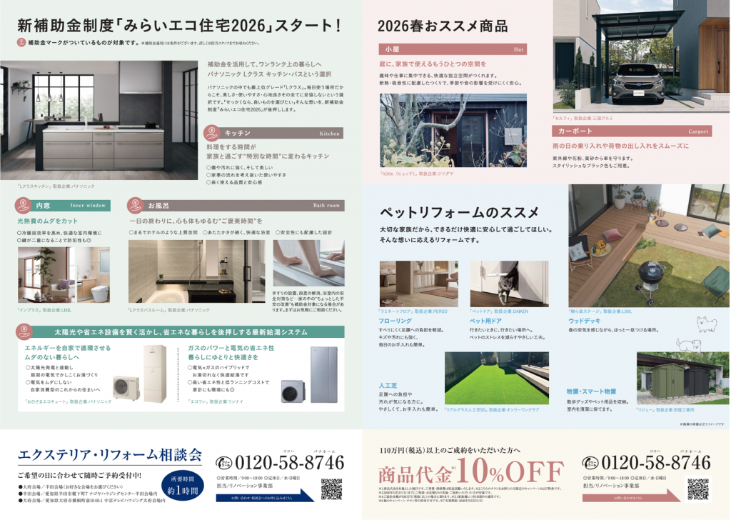 ※商品代金を対象とした割引です。工事費・諸経費は別途頂戴いたします。※こちらのフォームからお申し込みの方限定のキャンペーンおよび特典です。※ご成約金額が110万円(税込)以上の場合に限ります。※1家族様につき1回限りの適用です。※他のキャンペーン・チラシ等の併用不可です。※有効期限:2026年5月31日(日)