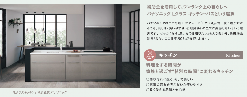パナソニックの中でも最上位グレード「Lクラス」。毎日使う場所だからこそ、美しさ・使いやすさ・心地よさそのすべてに妥協しないという選択です。「せっかくなら、良いものを選びたい」そんな想いを、新補助金制度「みらいエコ住宅2026」が後押しします。