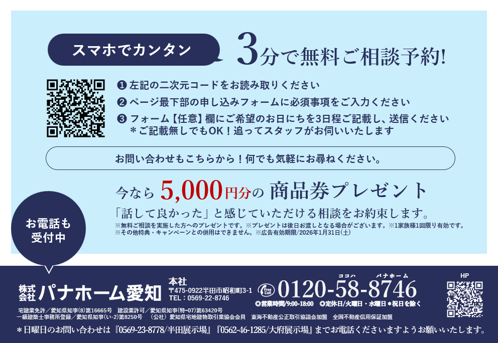 *日曜日のお問い合わせは 『0569-23-8778/半田展示場』『0562-46-1285/大府展示場』までお電話くださいますようお願いいたします。