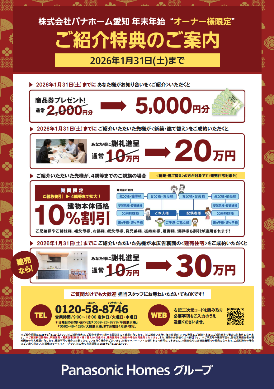 ※ご紹介期限は2026年1月31日(土)です。※ご成約特典は、ご紹介者様の口座へお振込みにて進呈いたします。※ご紹介いただいたお客様が、すでに弊社とご商談中またはご成約済みの場合は対象外となります。※ご親族割引特典は、戸建住宅・賃貸住宅(新築・建て替え)が対象です。建売住宅をご検討の場合は対象外となります。また、建物本体価格の10%割引です。※ご予定地の建築可否は、弊社営業担当者が現地調査のうえ確認いたします。建築不可の場合はお断りさせていただく場合がございます。※他キャンペーン・お値引きとの併用はできません。※建売住宅は各棟先着順での販売となります。ご成約済みの場合はご了承ください。※画像はすべてイメージです。※広告の有効期限は2026年1月31日(土)です。