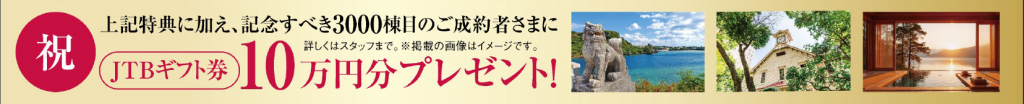 各コースのご成約特典に加え、3,000棟目のご成約者さまにはJTBギフト券10万円分をプレゼント!