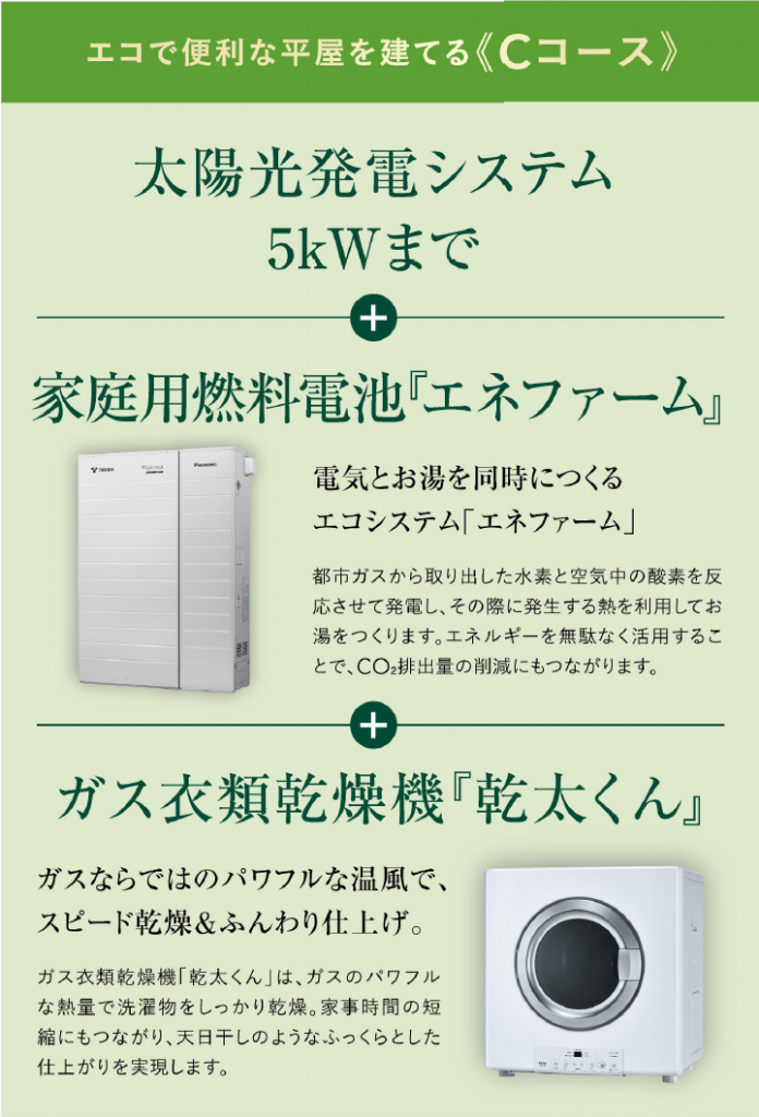 電気とお湯を効率よくつくるエネファームと、家事負担の軽減に役立つガス衣類乾燥機を組み合わせたプラン。