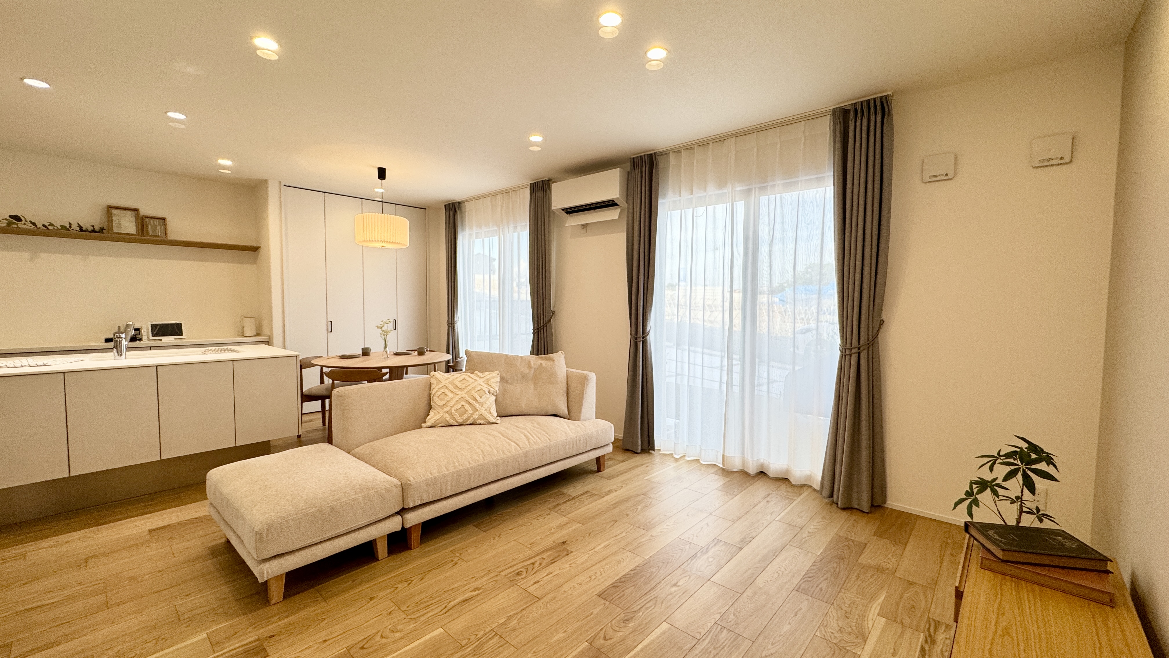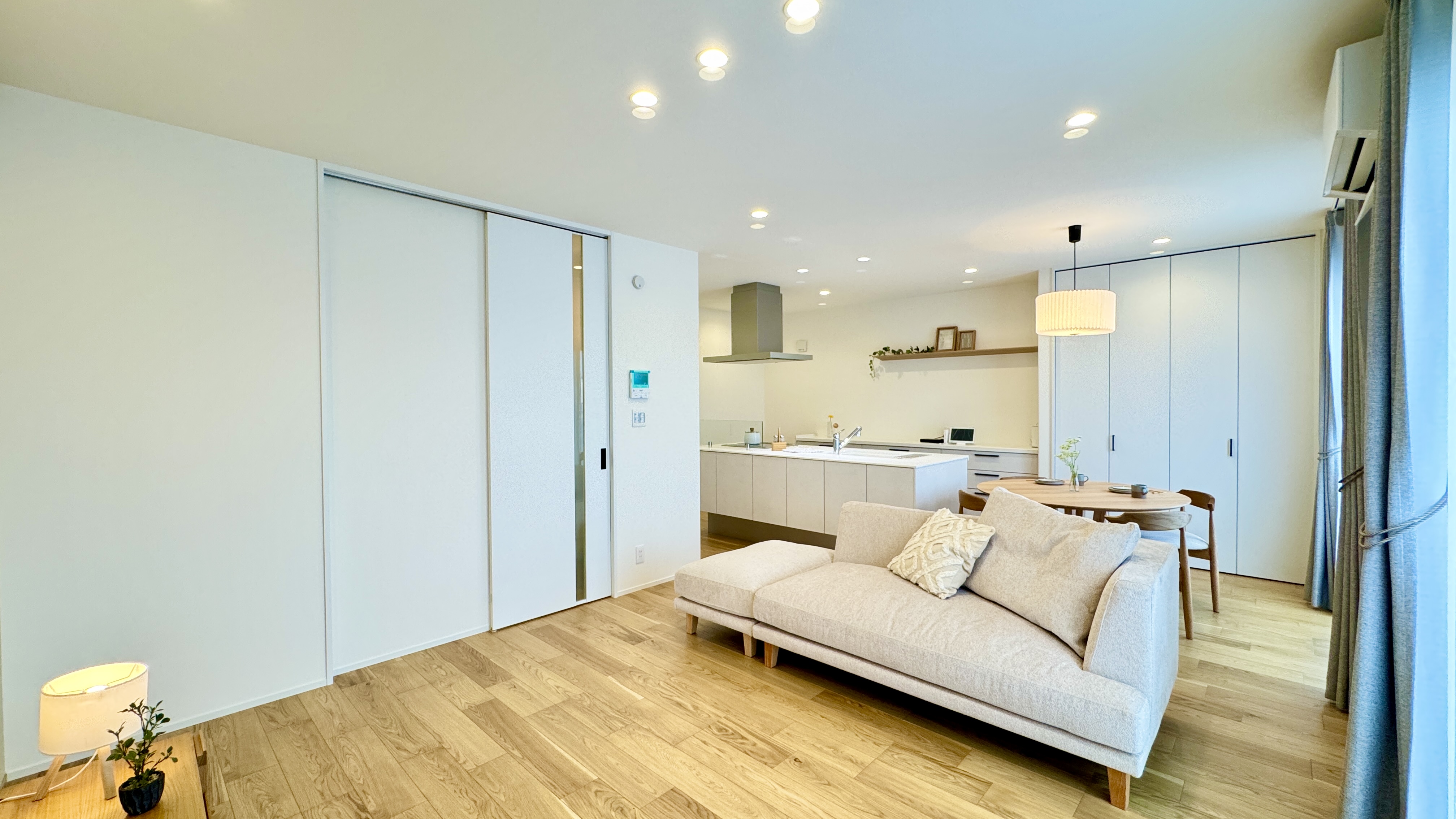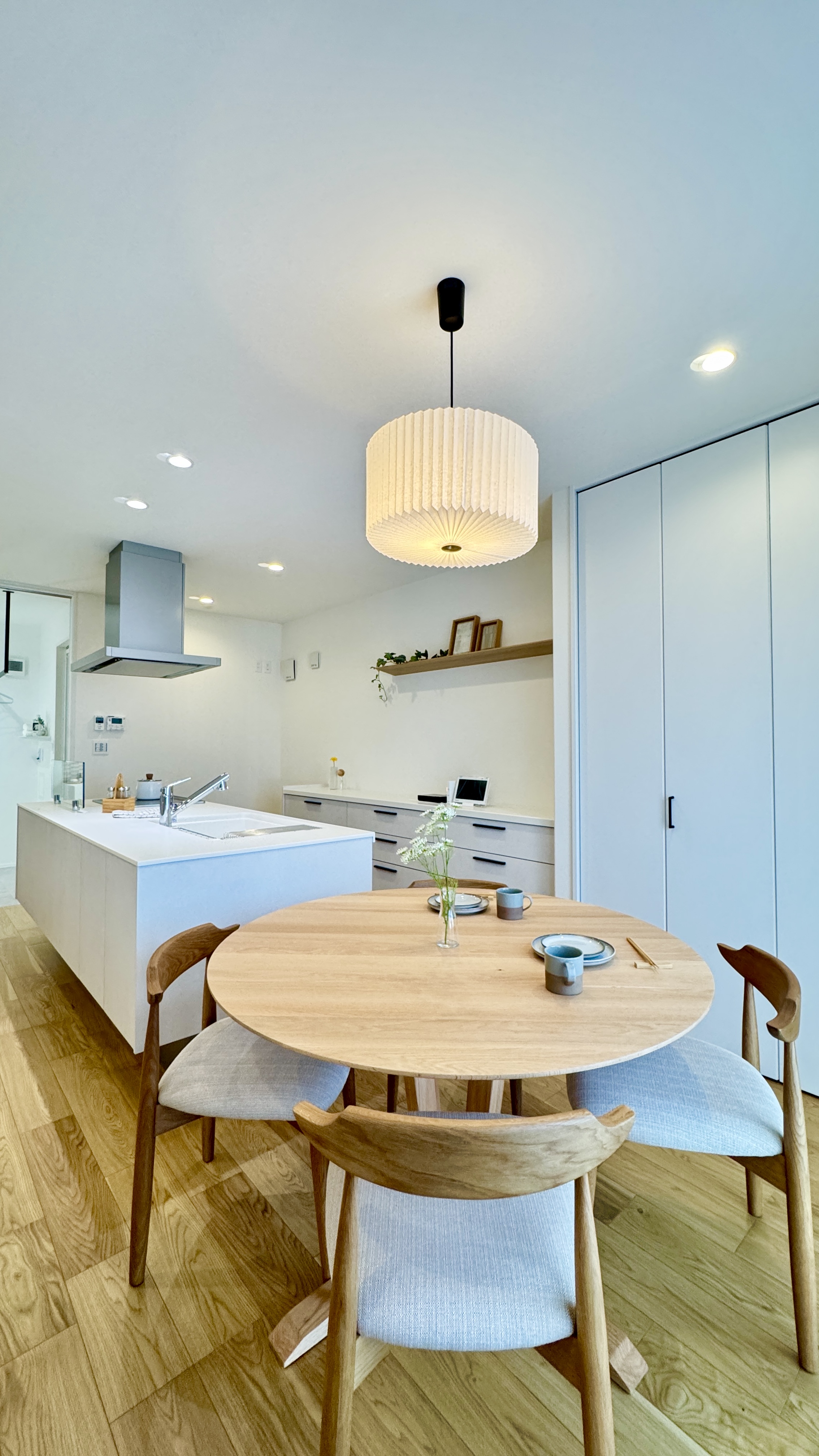 空間を引き締めるブラックのアクセントが、上質な静けさを演出します。円卓のダイニングと和の灯りが、家族の時間に品を添えます。