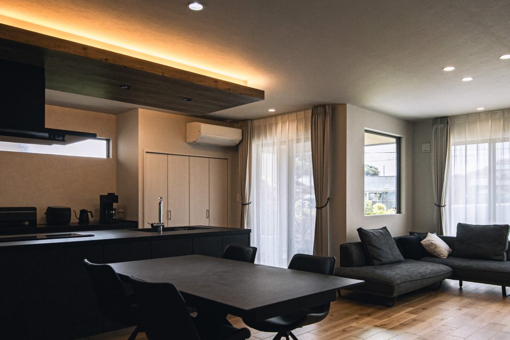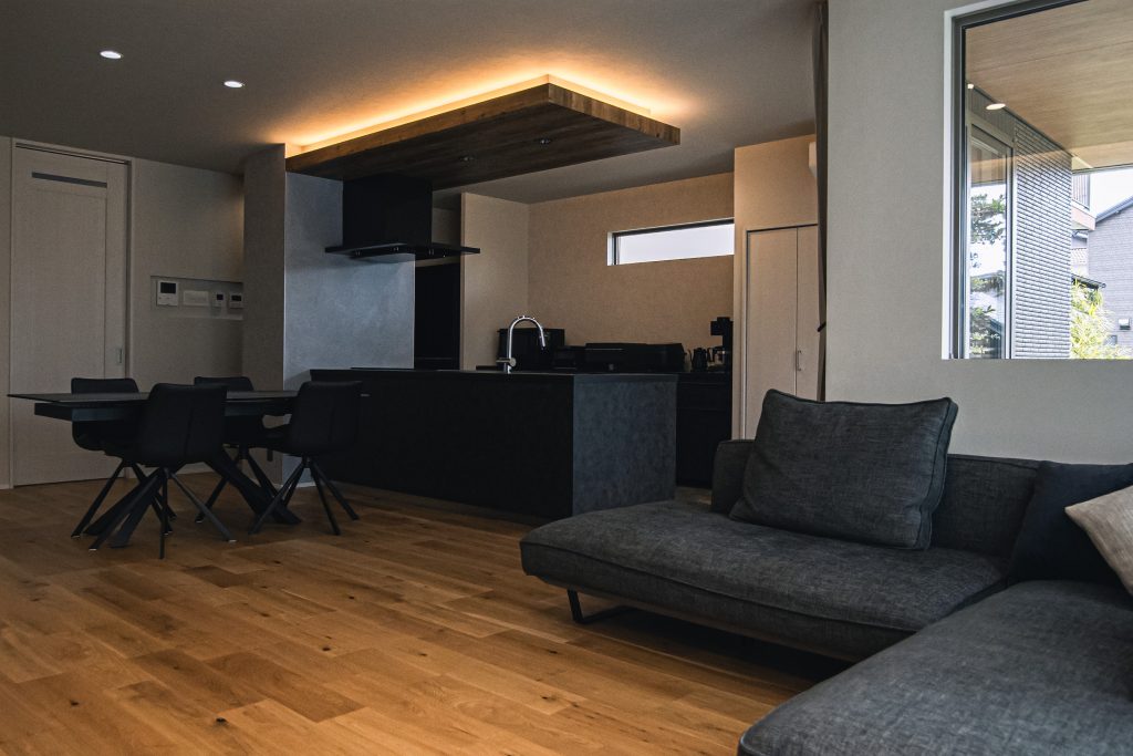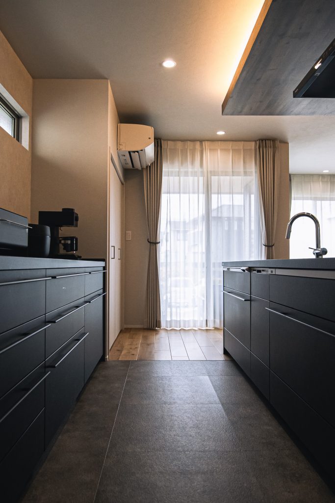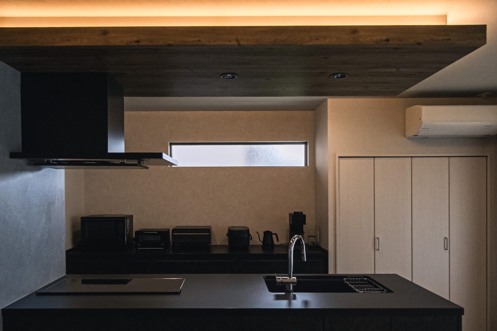 木目の下げ天井と間接照明が特徴的なキッチンは、空間のアクセントに。マットな黒で統一されたデザインが、高級感を引き立てています。