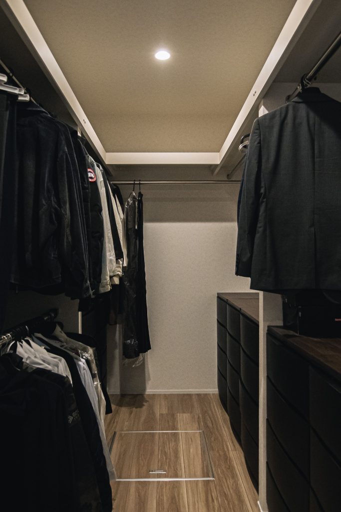衣類を見渡しやすくたっぷり収納できるウォークイン仕様。スーツやアウターなどもすっきりと管理でき、忙しい朝の支度もスムーズに。