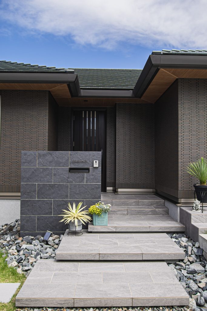 グレーのタイルと石を組み合わせた門柱とアプローチが、モダンで洗練されたエントランス空間を演出。植栽とのバランスも絶妙で、来客を心地よく迎えます。