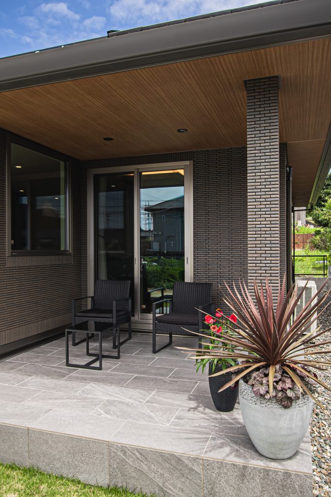 リビングから続くテラスは屋根の木目調と床タイルの質感が心地よく調和し、ちょっとしたカフェタイムにもぴったり。