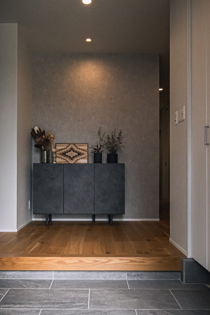 グレーのアクセントクロスとシックな収納が目を惹く玄関スペース。装飾や観葉植物が映える、センスの光るウェルカム空間です。
